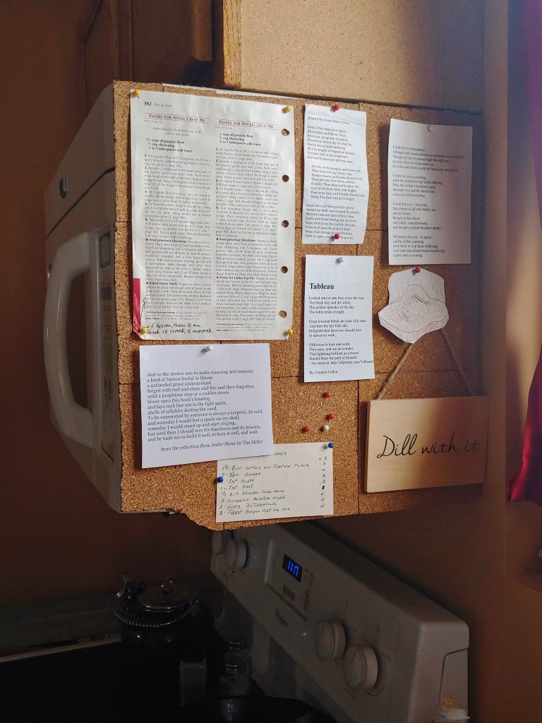 Well, recipes, obviously. Maybe a calendar. I have another, larger bulletin board that houses library and trash collection schedules, photos of friends and family, Christmas letters, things like that. But something else that I need around me is poetry.