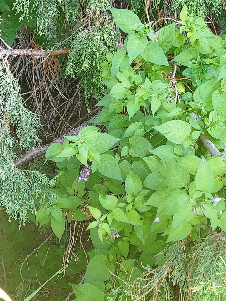 This instance of climbing nightshade is on our neighbor’s juniper, but we also have it in our raspberry patch!