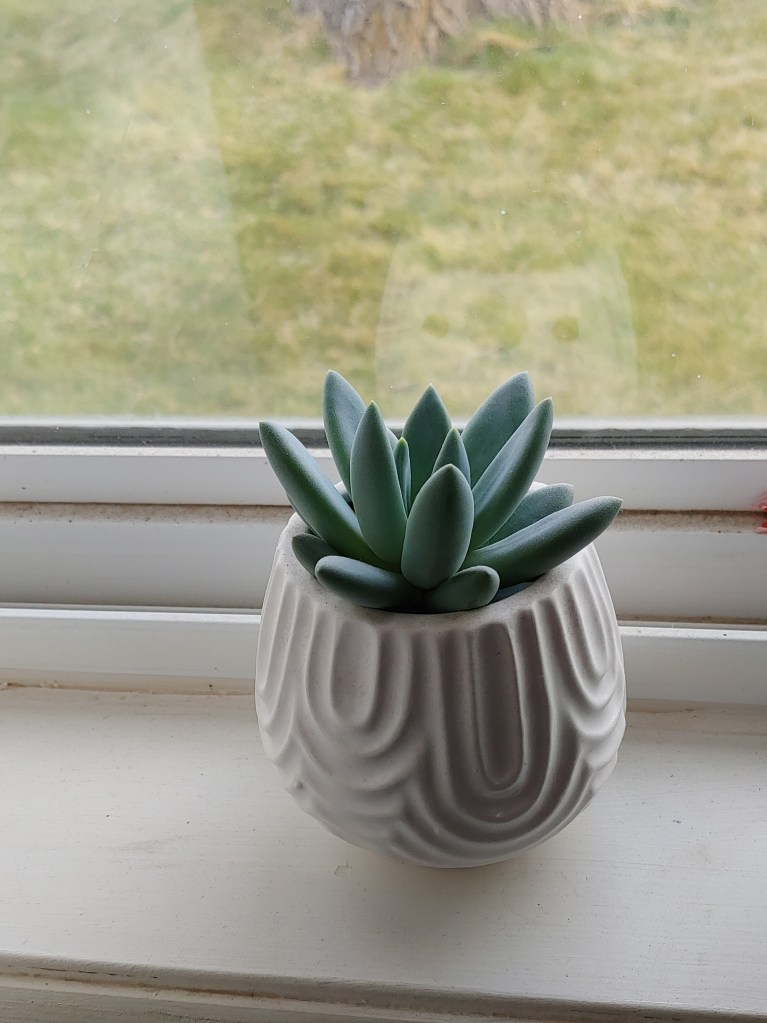 Here is Ms. Succulent in the new pot after transplanting. Since we do not have an oven to fire the paint in (and we probably used the wrong kind of paint for that anyway), the paint will bubble a little bit around the bottom whenever you water the succulent. But that is OK because we are only watering twice a month. The paint job might not last forever, but it will last a couple of years.