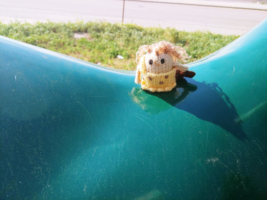 For now, here are some whimsical pictures of Neanderthal Woman. This little knitted cave person, custom made for me by a friend a few birthdays ago, turns out to be the perfect mascot to bring along on a trip and pose in various places. She is light, durable and squishy enough to carry in a pocket, and as a cave person, she is an endless source of prehistory-related tie-ins. She recently made the trip across the country and back dangling from my rearview mirror. Thanks, Arelis! NW is the gift that keeps on giving.