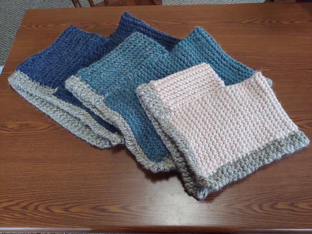 This knitting project, on the other hand, is about the easiest gift you can make for a little girl (or three) if you just have basic knitting skills. For each poncho, I simply knit two identical rectangles, then sewed them together in the poncho shape. I used super-chunky yarn, large needles, and cast on 25 stitches for the larger ponchos (which fit a school-aged child) and 20 stitches for the smaller poncho (which I hope will be the right size for a preschooler). They are in garter stitch, which means I knit on the right side and the wrong side, instead of purling on the wrong side, which would have produced stocking stitch. The only thing I did that was slightly challenging was to use a different color of yarn for the border.