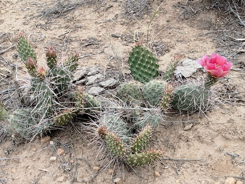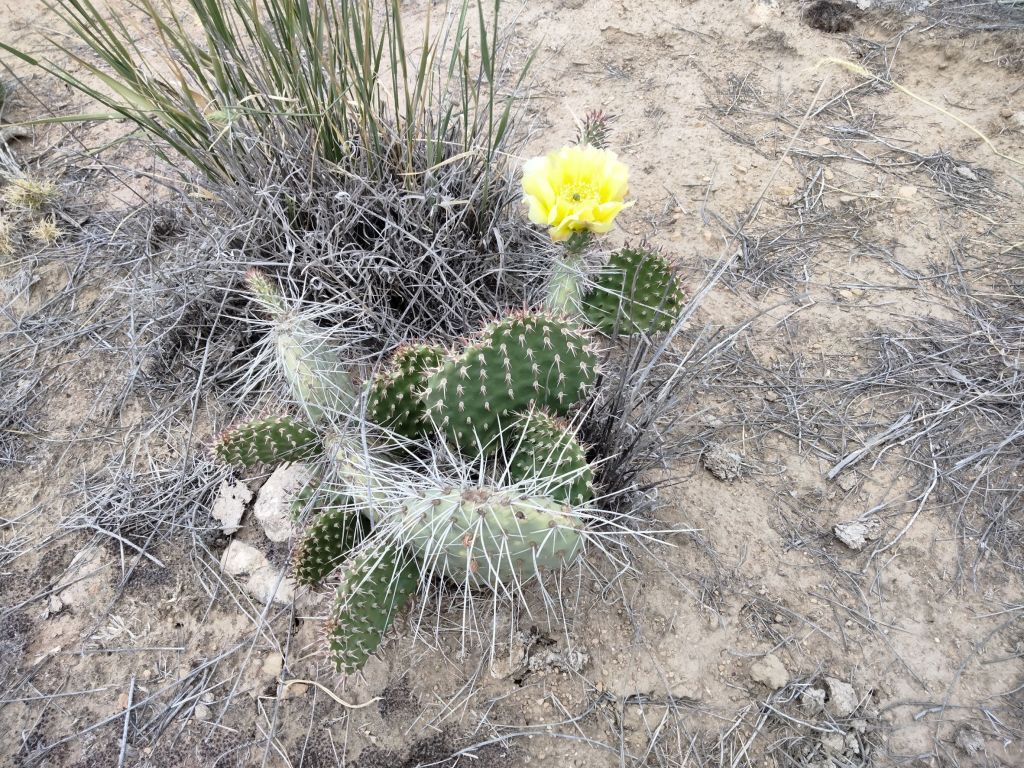 The long spines and flattened, blue-green pads of the plains prickly pear are familiar to anyone who has had the misfortune to step on one. As if the sharp, long spines are not trouble enough, the plants are also armed with a ring of tiny, hairlike barbs (glochids) at the base of the larger spines. These tiny barbs look harmless, but once touched they penetrate the skin and refuse to let go. However, the beautiful flowers of prickly pear more than compensate for the dreaded spines. The flowers are large, up to 3″ or more, with numerous red to yellow petals. The fruit is a pear-shaped berry, dry and very spiny, unlike the juicy “tunas” of some southwestern species of prickly pear.