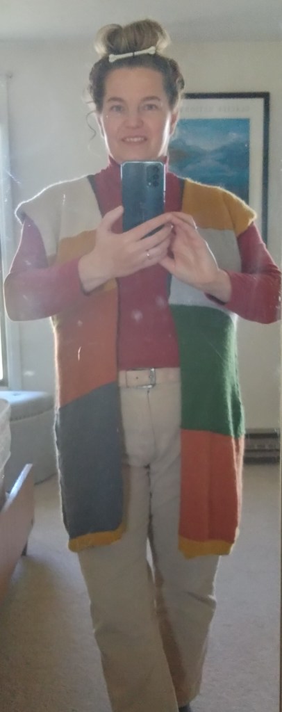 For the dimensions, I referred to a pattern for a bulky sweater with sleeves and a shawl collar, but just left those off. I began by knitting granny squares and then sewing them together, but as the work progressed, I found I had to pick up stitches on the end of finished squares and then just sew the sides together. I added a few rows of ribbing at the arm holes and neck, and a few more rows of ribbing along the bottom.