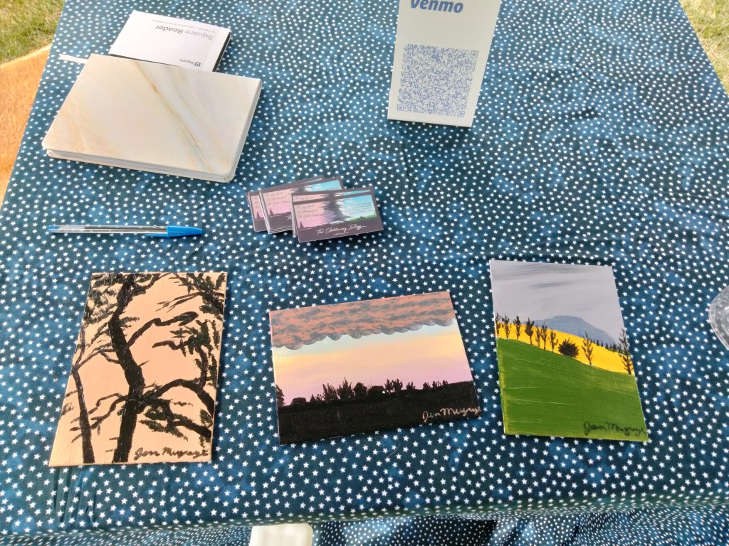 Of course, you have to get permission to set up a booth, pay a fee, etc. Luckily, we already had a good-looking booth that we had designed for the Medieval Fantasy Faire earlier in the summer. We added the banner this time, because previously people were confused by the fact that we were selling more than one thing. It was my son’s idea to call our booth Cosmic Tree. He got this from the fact that his paintings are hung up inside the booth, like fruit on a tree, and they are mostly starscapes.