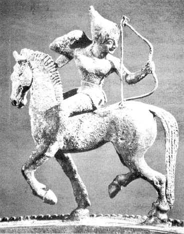 The “Parthian shot.” The Parthians were a people related to the Scythians and other horse-riding groups of Central Asia. That conical hat, too, is found among the Scythians, a people who live in what is presumed to be the Indo-European homeland.