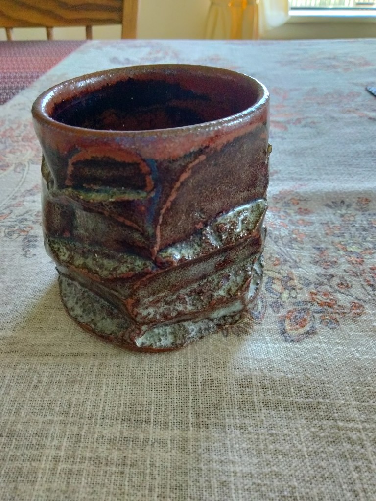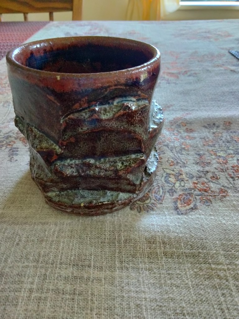 This lovely thing was purchased at the Fantasy Faire, from a stonewear booth (advertising slogan: “Get Stoned”). I asked the potter, an older lady, about her process, and she said, “I take some clay. I throw it on the wheel. I make a cup. I glaze it, and then I fire it.”
