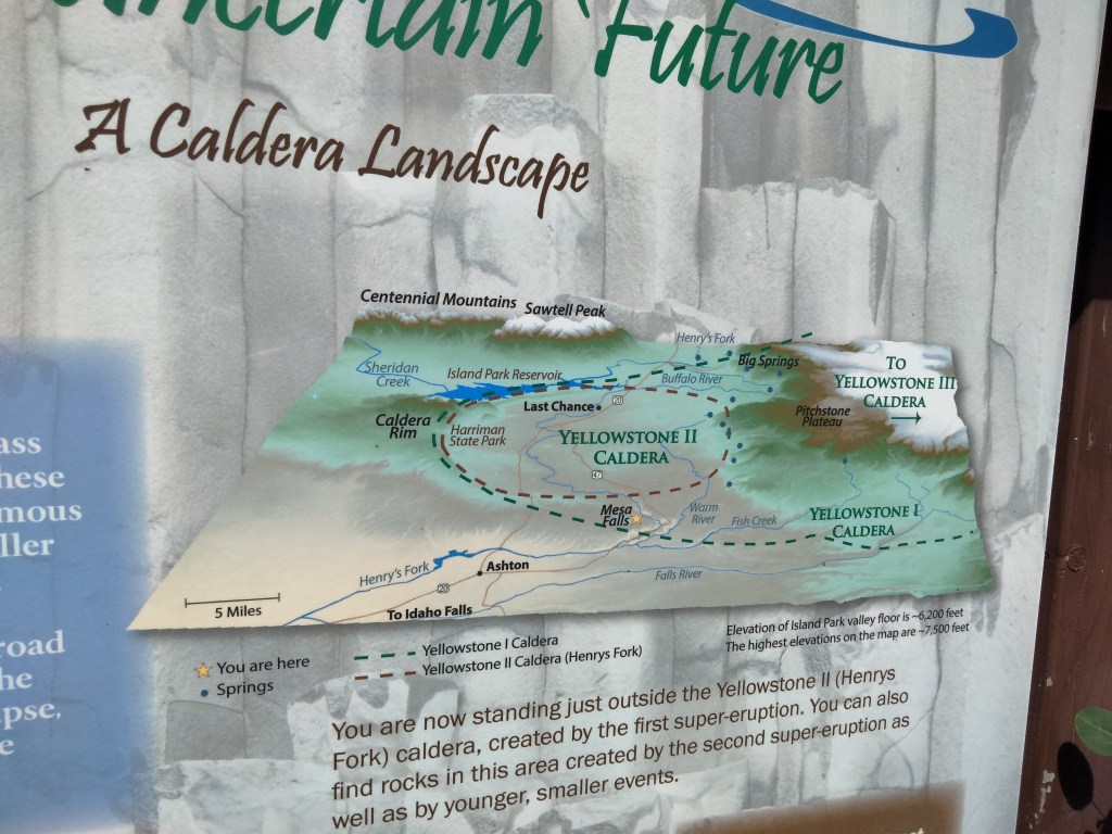 As you can see from the map above, Mesa Falls lies in part of an old caldera. The earth’s crust has moved, putting the fresh caldera under Yellowstone National Park. Hence the geysers that can be found in Yellowstone, and the eerie, sulfur-scented, brightly colored, deadly hot springs (which incidentally play a cameo role in my book The Strange Land).