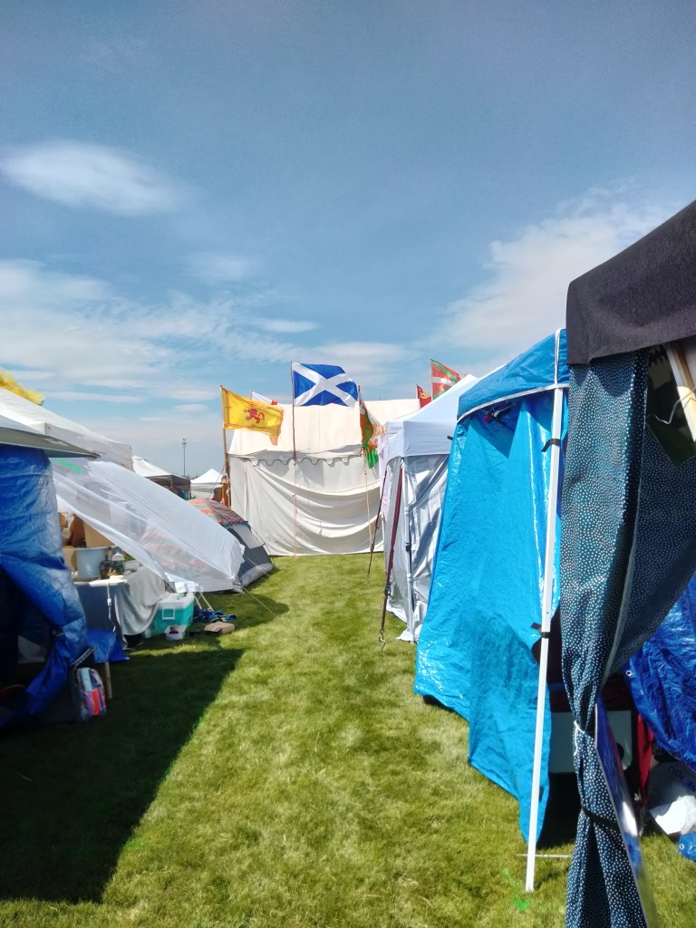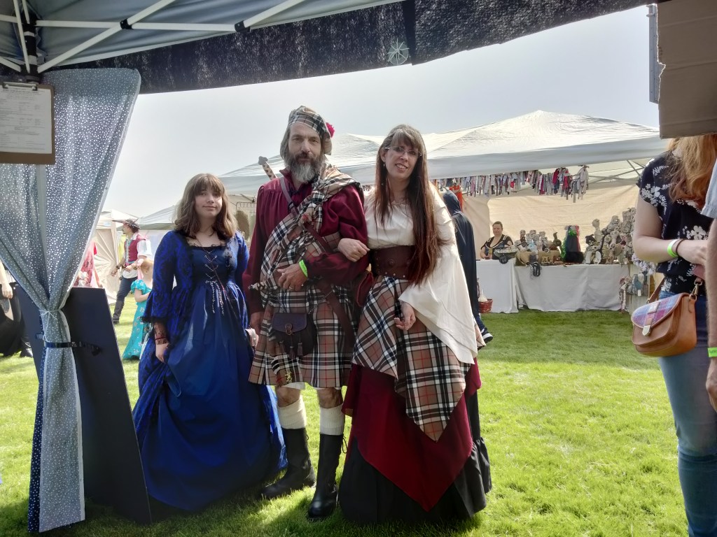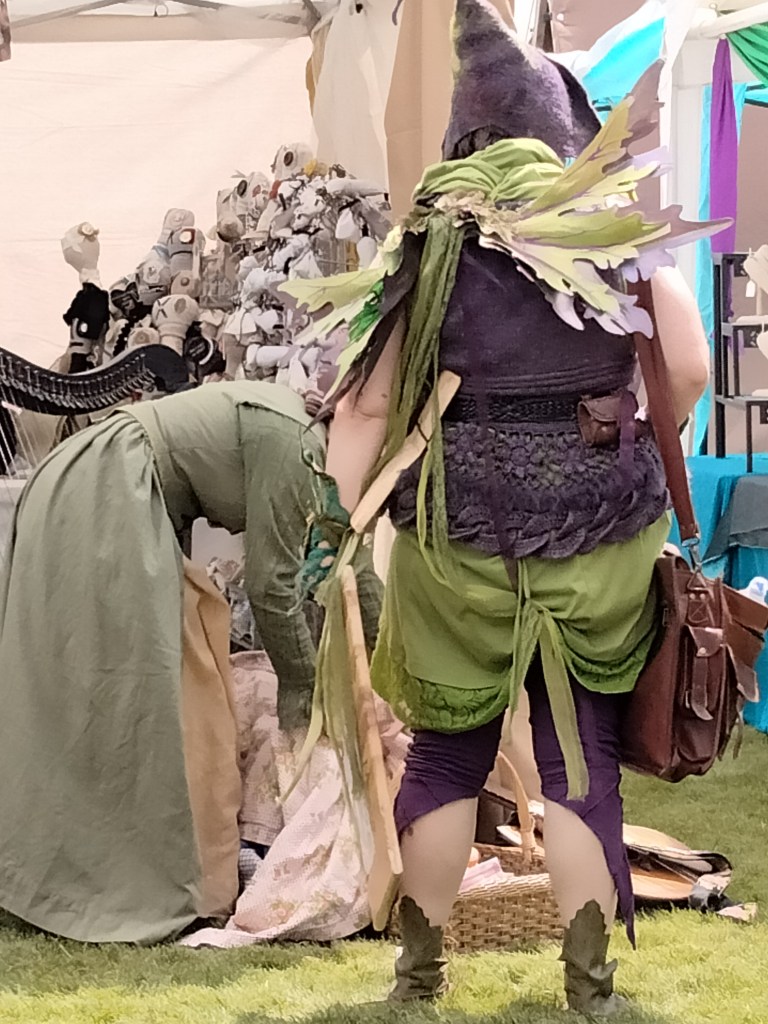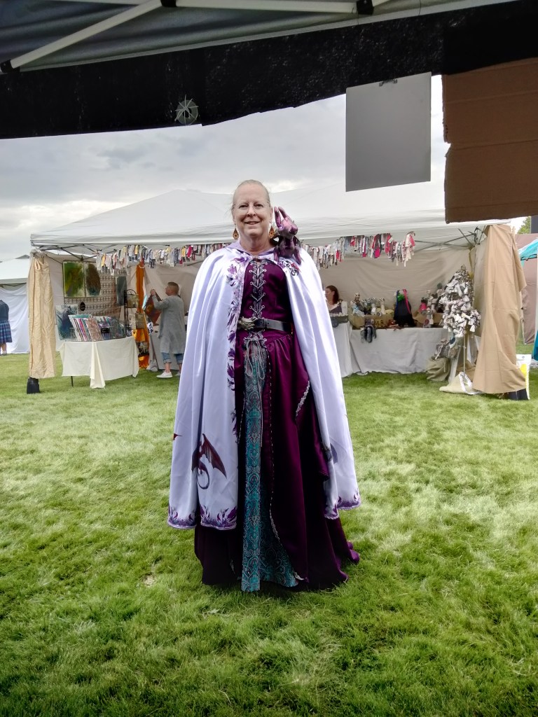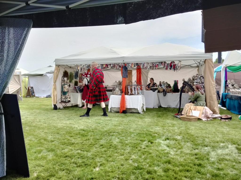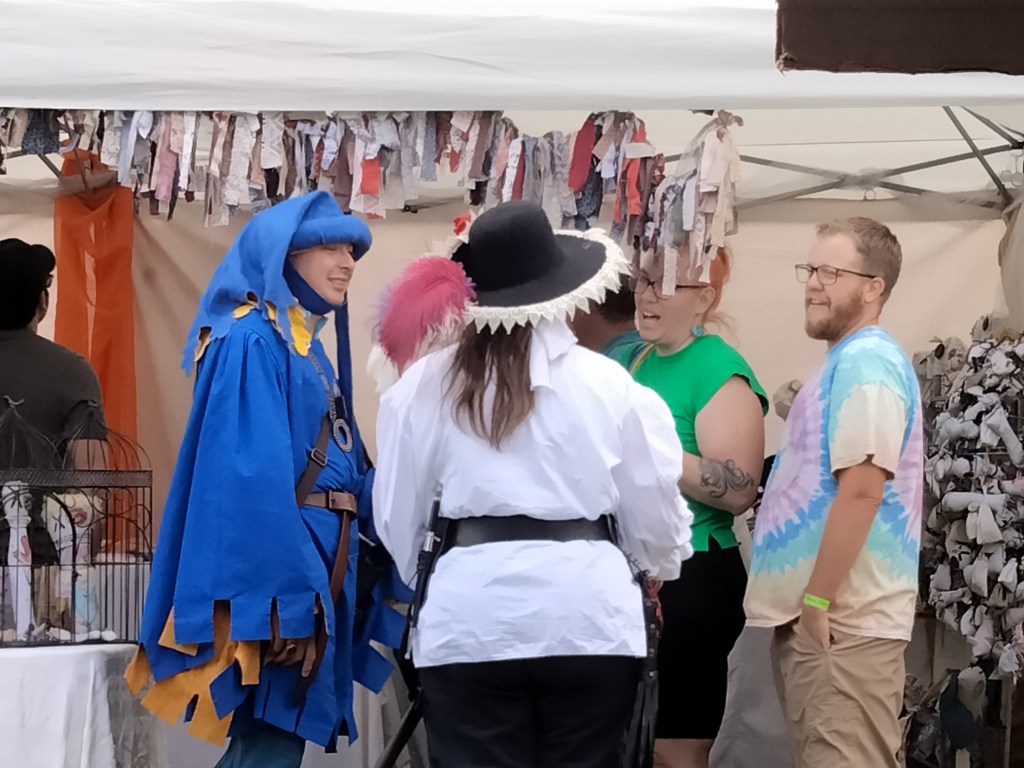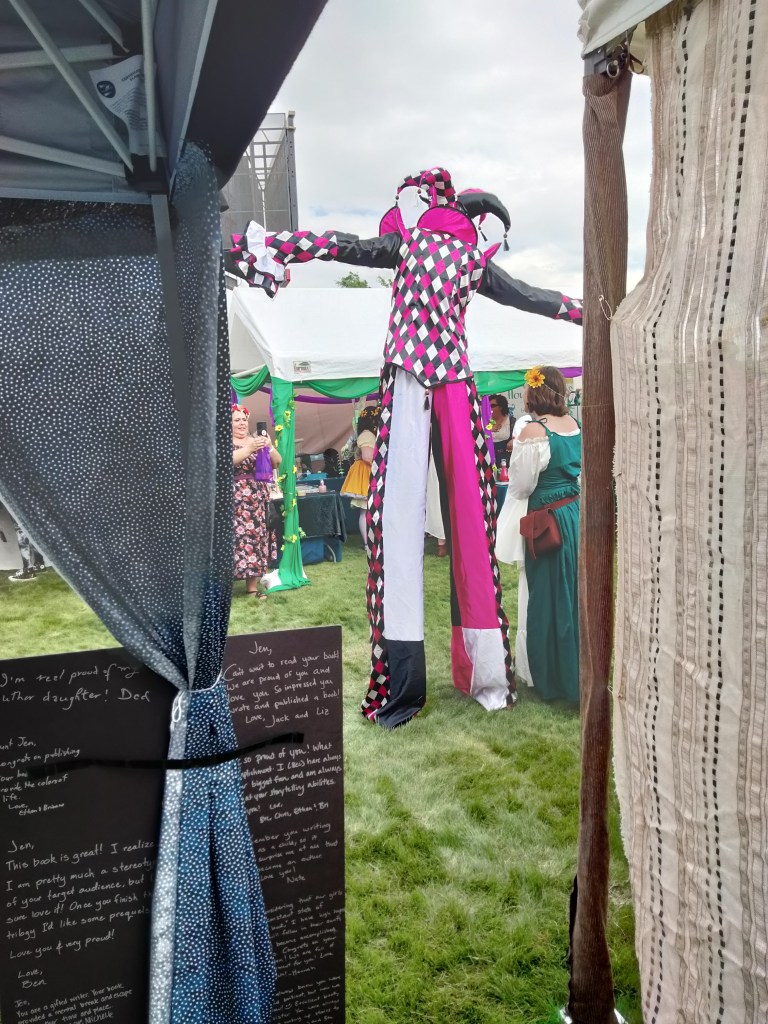 Of course, you have to get permission to set up a booth, pay a fee, etc. Luckily, we already had a good-looking booth that we had designed for the Medieval Fantasy Faire earlier in the summer. We added the banner this time, because previously people were confused by the fact that we were selling more than one thing. It was my son’s idea to call our booth Cosmic Tree. He got this from the fact that his paintings are hung up inside the booth, like fruit on a tree, and they are mostly starscapes.