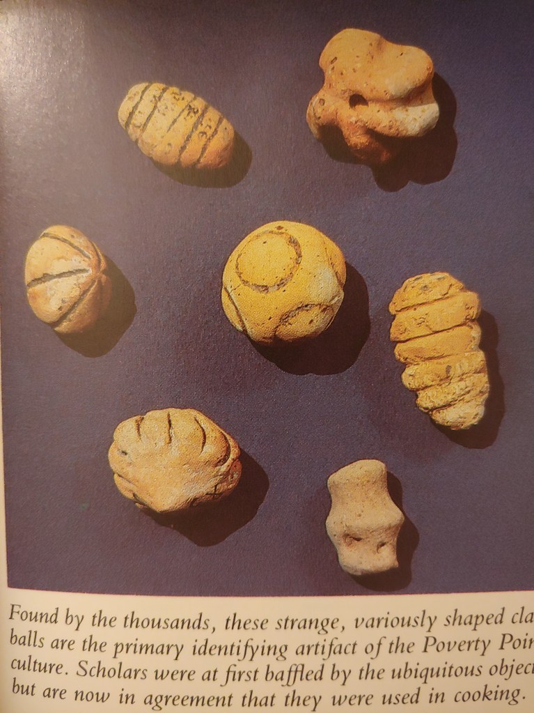 The Poverty Point people, reconstructers think, would wrap fish, meat, or potatoes in wet leaves, place them on a bed of hot coals, and then cover them with a layer of hot clay balls. You know, they basically made what at camp we used to call a “hobo dinner.” Except we were always eating our hobo dinners half-raw, because we were not as patient as the people at Poverty Point.