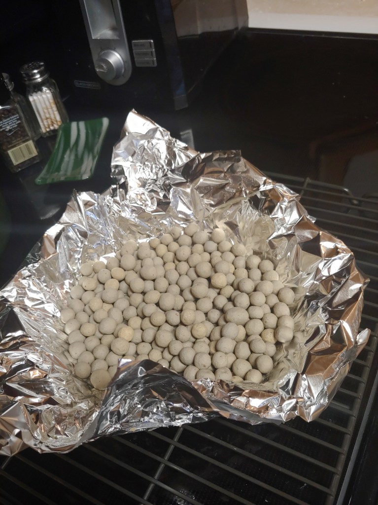 Not the greatest lighting on this photograph, but here they are, sitting in a nest of aluminum foil, on my ultramodern, convenient electric stove. The only modern use of clay cooking balls that I am aware of, is to make baked pie crust shells. If you bake the pie crust with nothing in it, it bubbles up, warps, and then it can’t hold the instant pudding later. You have to weight it down with something. You can use just two layers of aluminum foil, but heavier is better. For a while I was using uncooked lentils (per Martha Stewart). They worked OK, but they had a certain legume-y smell when baking and besides, clay cooking balls are so much cooler. I suppose that in a pinch, I could use them for pit cooking. Let’s hope it never comes to that.