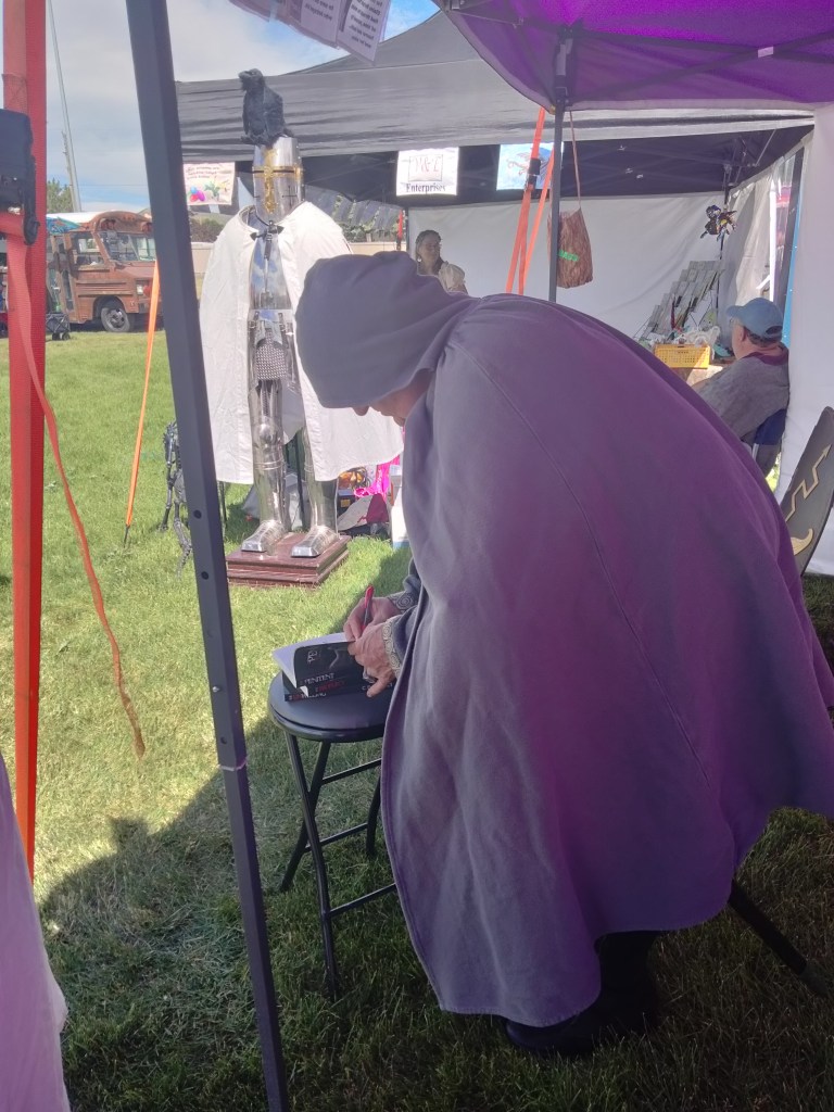 C. David Belt, who is taking his costume in a Scottish direction and was rocking a Scottish accent, is an LDS (Mormon) horror writer. Last year, I bought and reviewed his book The Sweet Sister. This year, I bought his Lilith trilogy. Here he is signing them for me.