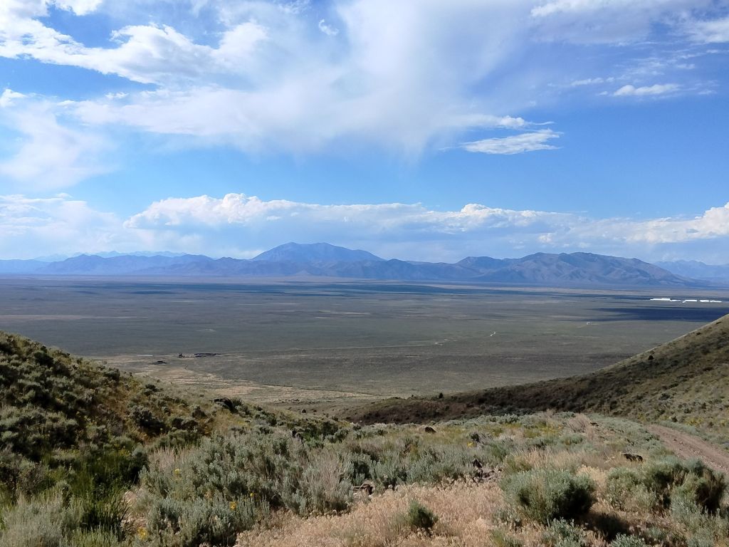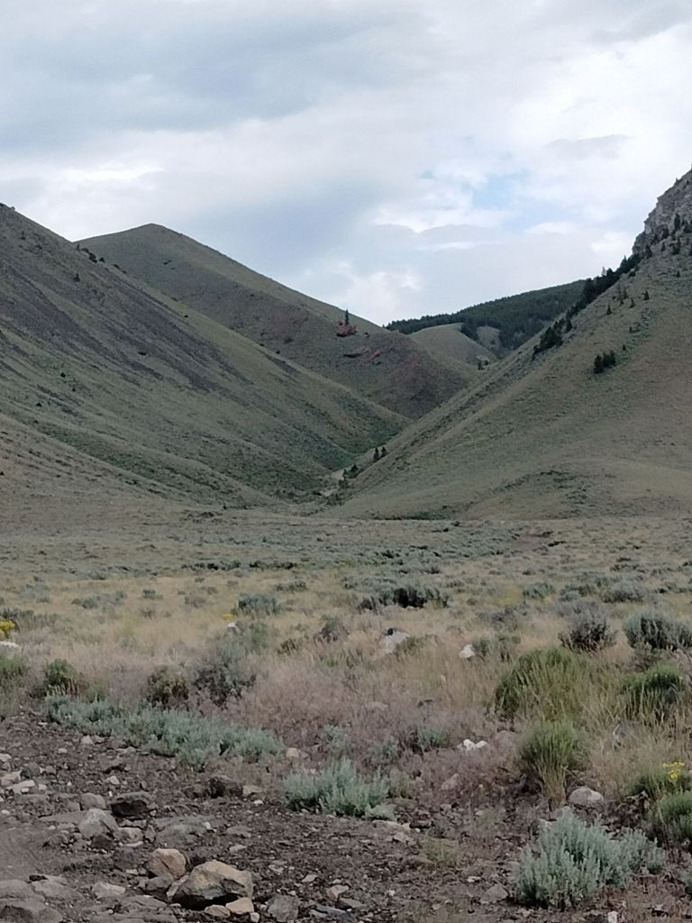 Here are the Sawtooths as seen from our parking spot. My husband says these are not the actual Sawtooths. I understood the whole region was called the Sawtooths, and then there were sub-ranges within the region, so I don’t know. Even with this little bit of height, you can start to see into the ranges. Back here are the Pioneer Mountains and the Lost River Range, among others.